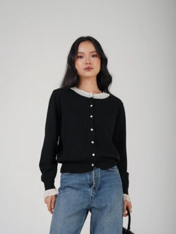 Detail lace collar & cuff yang manis dipadukan dengan pearl button accents menciptakan look yang elegant, chic, dan slightly vintage-inspired — perfect untuk daily look hingga semi-formal occasion.